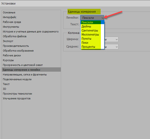 Как поменять единицы измерения в фотошопе