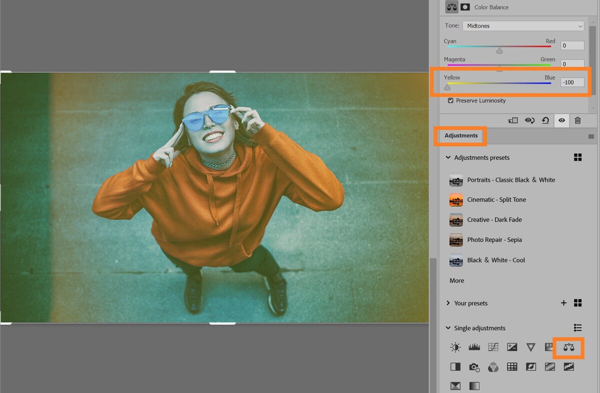 Откройте фотографию в Adobe Photoshop и выберите инструмент Коррекция цветов.