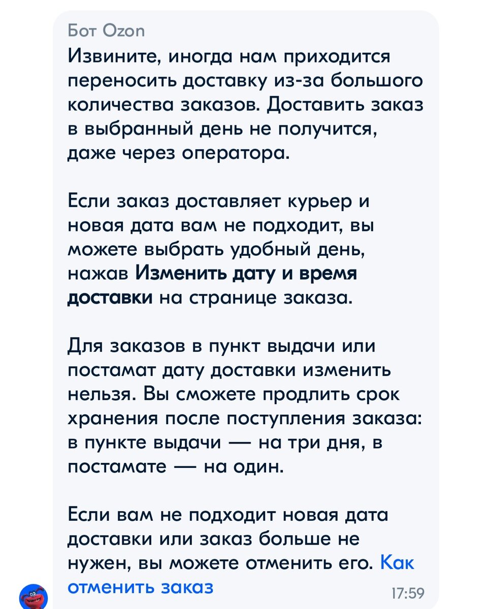 В случае проблем с доставкой или изменением заказа обратитесь в службу поддержки Озона для получения помощи.
