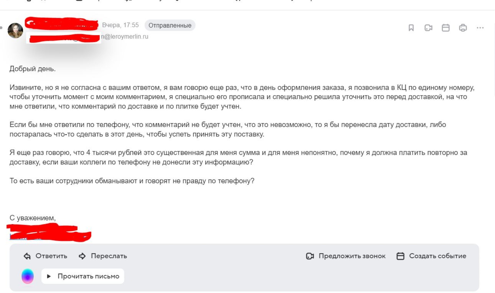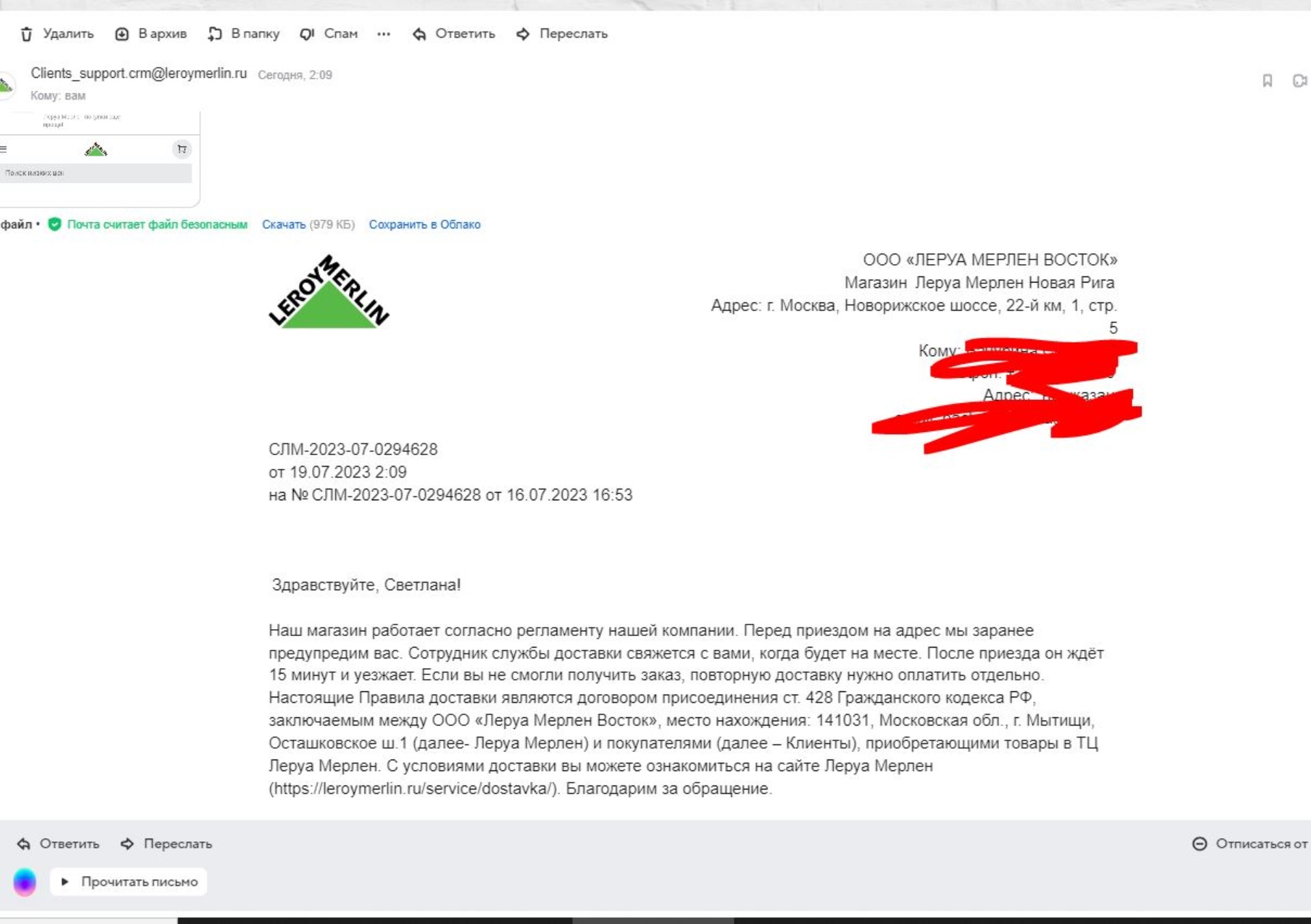 В случае возникновения вопросов или проблем с доставкой, обратитесь в службу поддержки Леруа Мерлен.