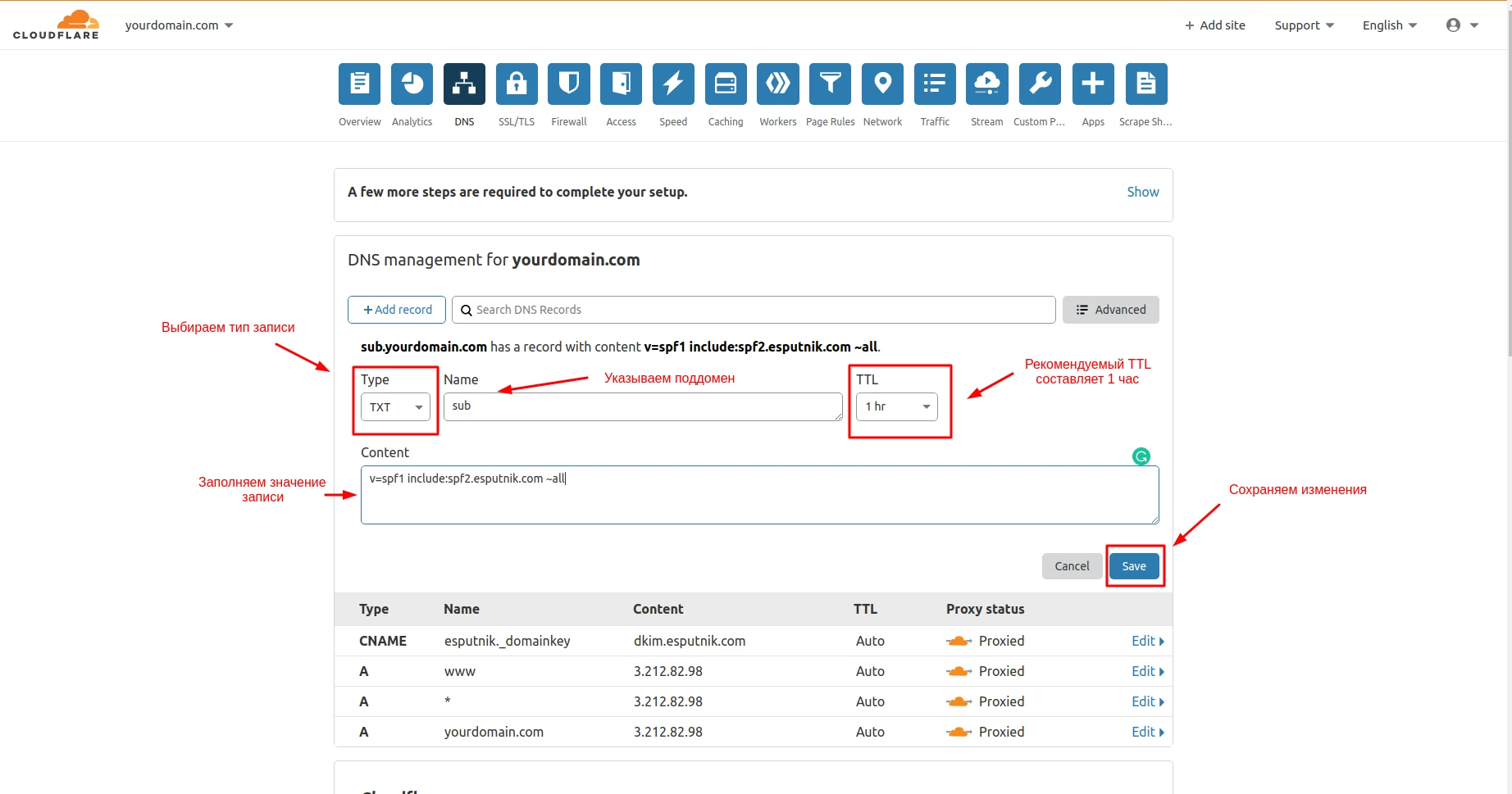 Настройте домен, для которого хотите добавить TXT запись, в разделе DNS-управление.