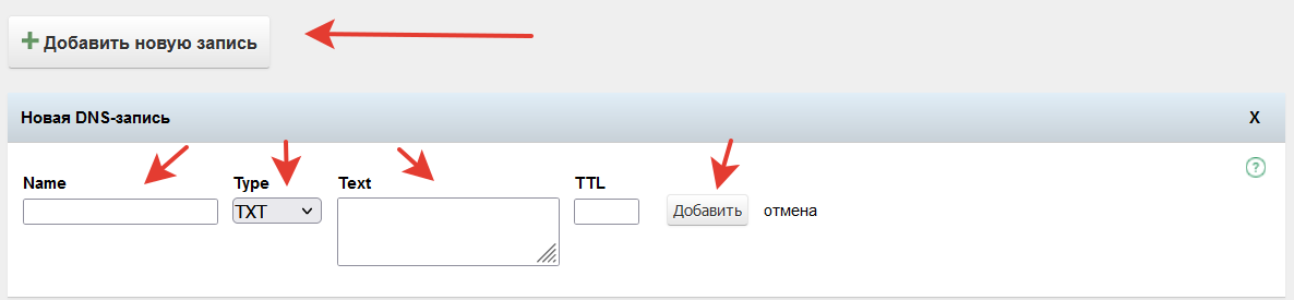 Нажмите кнопку Добавить новую запись и выберите тип TXT.