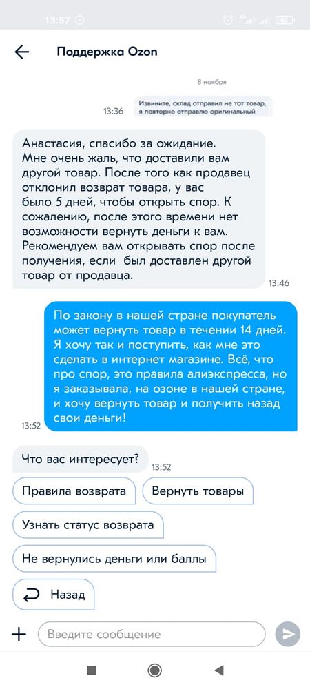 Помните, что в случае неправильного товара на Ozon, вы имеете право на возврат средств или обмен на правильный товар.