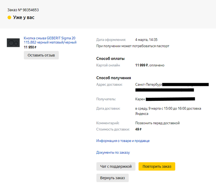 При обращении в Яндекс Маркет или курьерскую службу, имейте при себе все документы, подтверждающие ваш заказ и оплату.